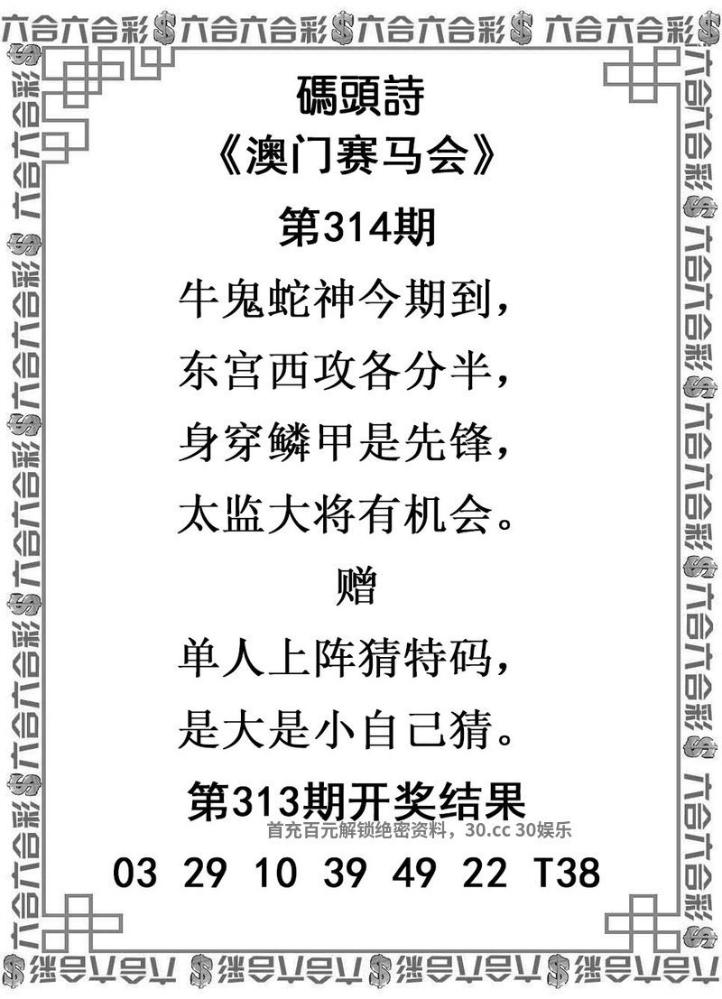 | 314期解析:牛鬼蛇神今期到,东宫西攻各分半,身穿鳞甲是先锋,太监大将有机会。 综合生肖:鸡兔羊马猴鼠蛇 必中四肖:鸡兔羊马 |